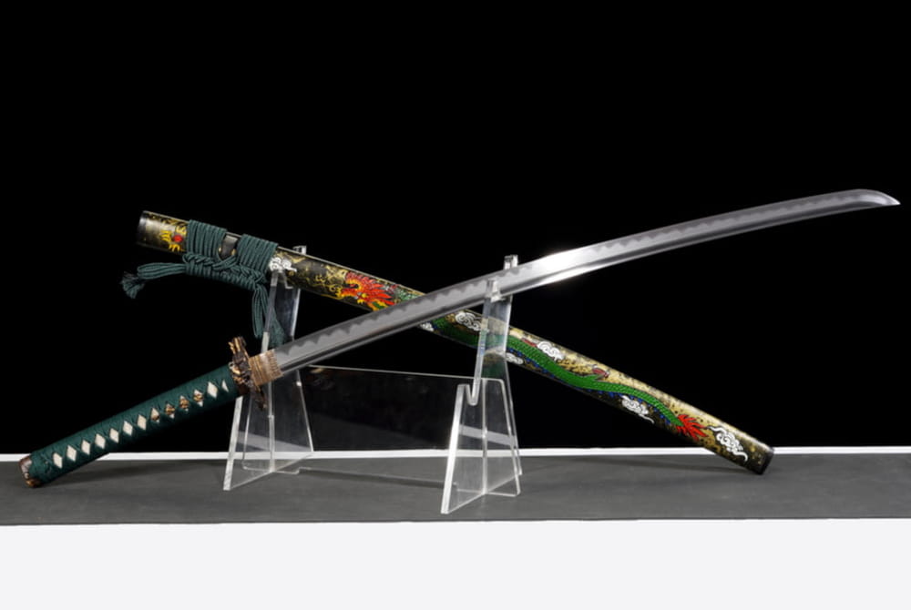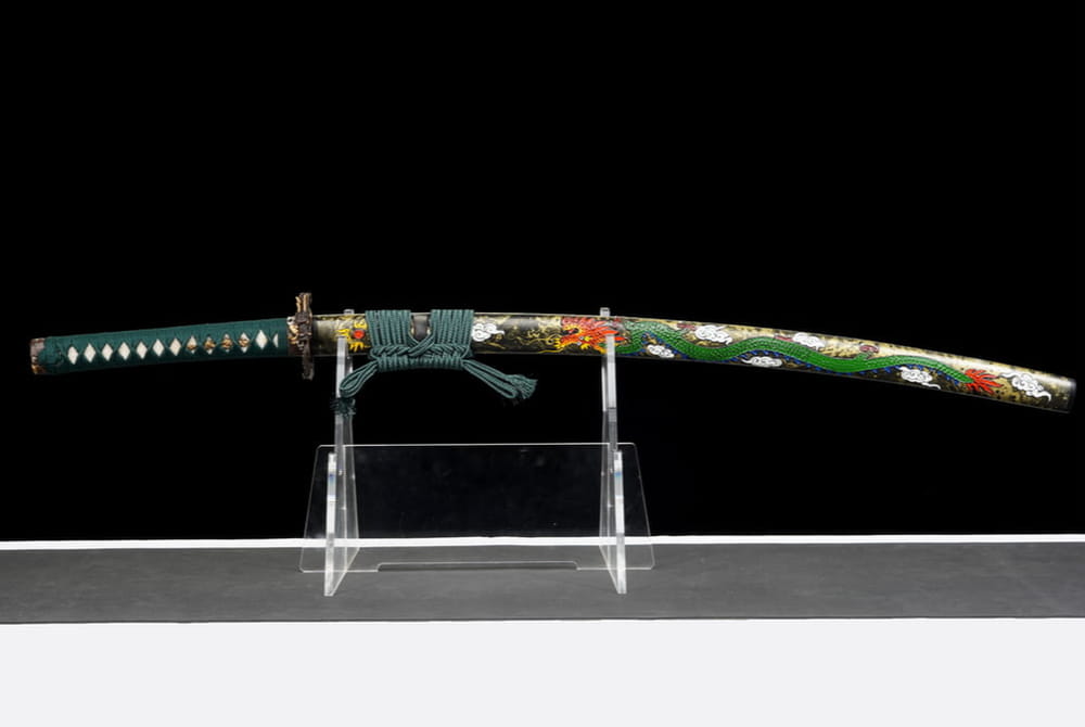 This katana immediately stands out thanks to its richly decorated scabbard, blending dark and golden tones with finely painted dragons — powerful symbols of wisdom and strength in Japanese tradition. The motifs stand out with depth and relief, giving the sword a strong yet refined visual presence.