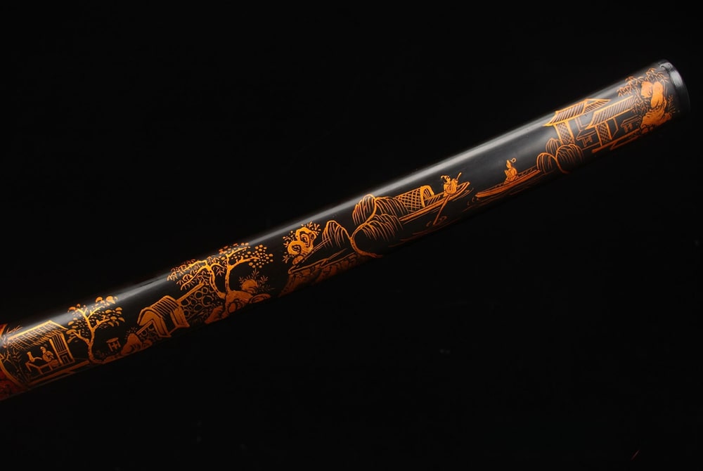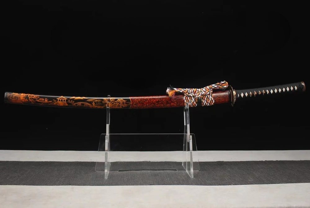 The handle of the katana is wrapped in genuine ray skin and tightly bound with Japanese silk, offering a grip as graceful as cherry blossoms in bloom. Real gold and silver fittings add a touch of splendour to this martial work of art. The saya of the Mura no Hogo Katana is a true masterpiece in itself, adorned with Japanese paintings that tell the story of the village. This piece transcends a simple sword to become a guardian of tradition and heritage.