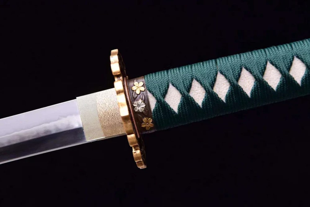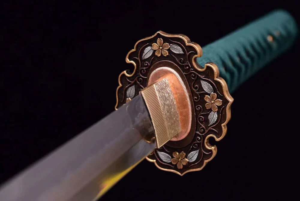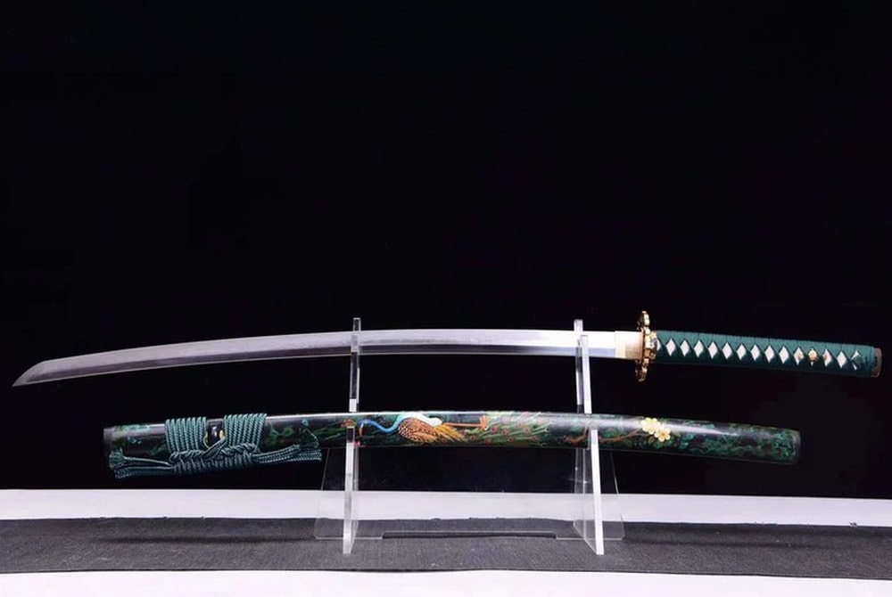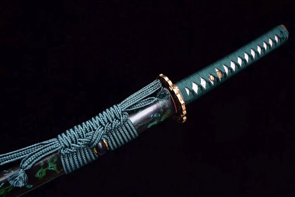 Discover the Midori no Ha Katana, a beautifully forged T10 steel sword featuring a distinctive Choji hamon that highlights its meticulous craftsmanship. The green handle adorned with traditional patterns offers timeless elegance, while the copper tsuba is embellished with delicate floral motifs. Perfect for collectors and admirers of refined Japanese sword-making.
