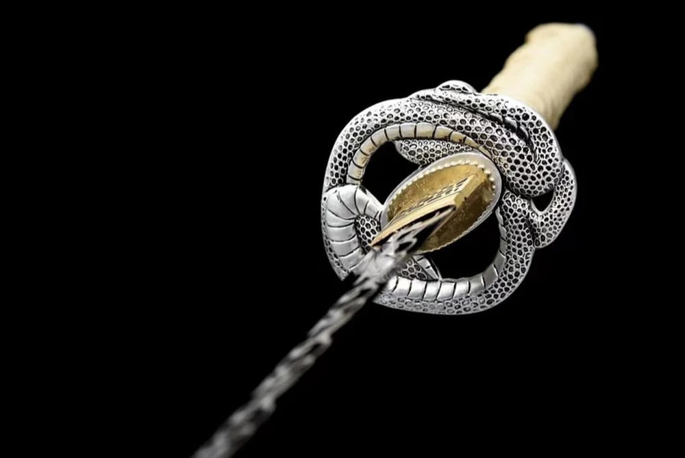 The Orochi no Tamashii Katana pays tribute to the legendary eight-headed serpent from Japanese folklore. Cloaked in deep black and adorned with golden motifs, it radiates a mystical and majestic presence. The tsuba, shaped like an intertwined serpent, embodies Orochi’s power and cunning, while the blade — delicately engraved with flowing patterns — evokes the hypnotic movements of the creature itself. Its beige handle wrapped with black braid creates an elegant contrast while ensuring a perfect grip. A rare piece, created for those who seek the union of beauty and ancient symbolism in an exceptional katana.