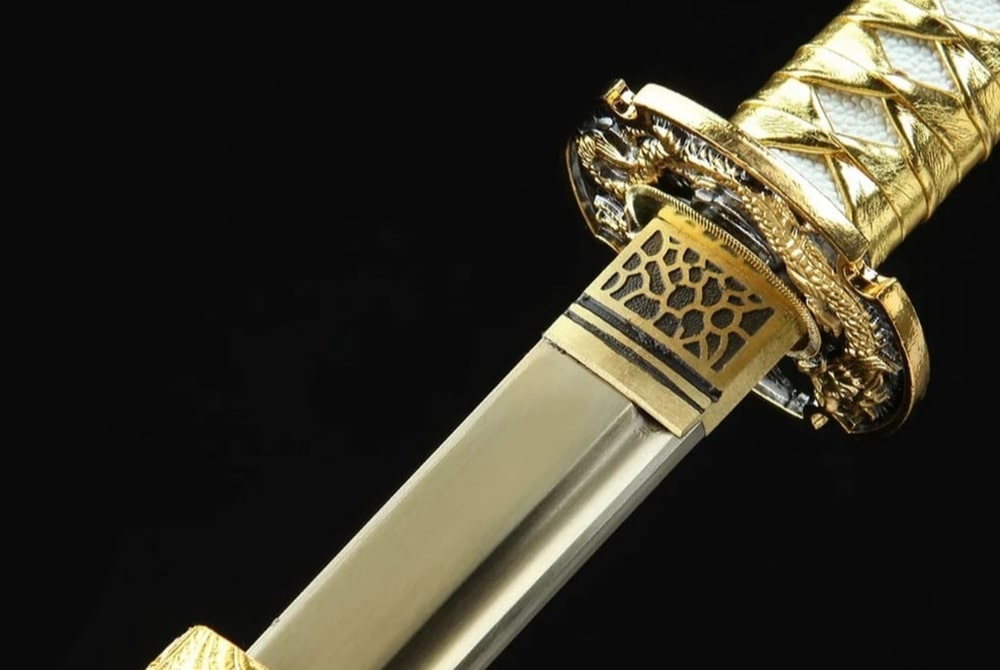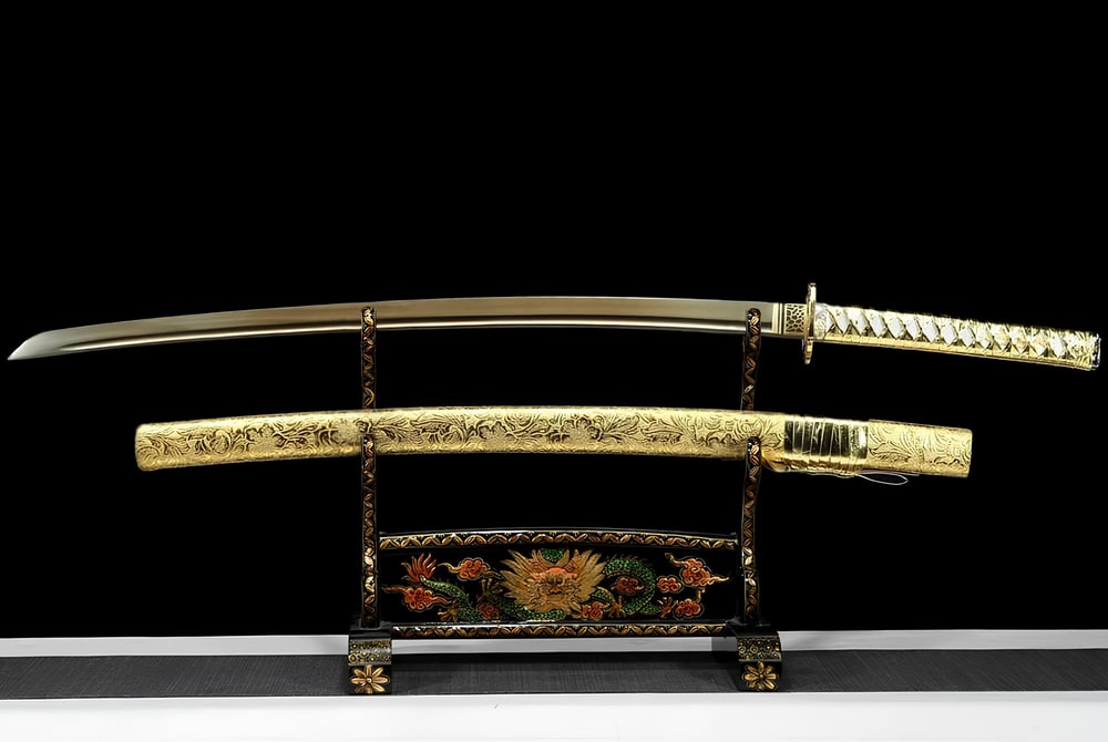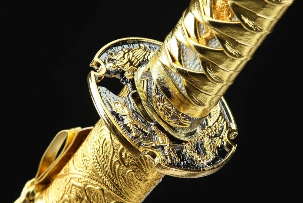 A true handcrafted gem, the Ougon no Ken Katana captivates with its golden shine and refined finish. Forged from manganese steel, it combines strength, balance, and premium craftsmanship. Its scabbard and tsuba are finely engraved with traditional Japanese motifs, embodying the power and nobility of the ancient samurai.