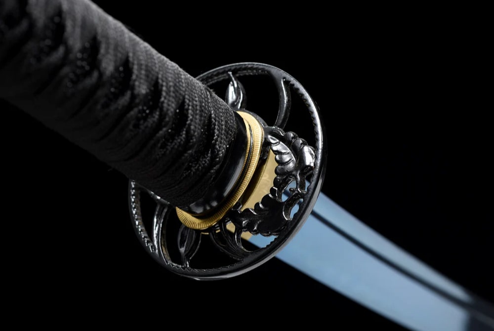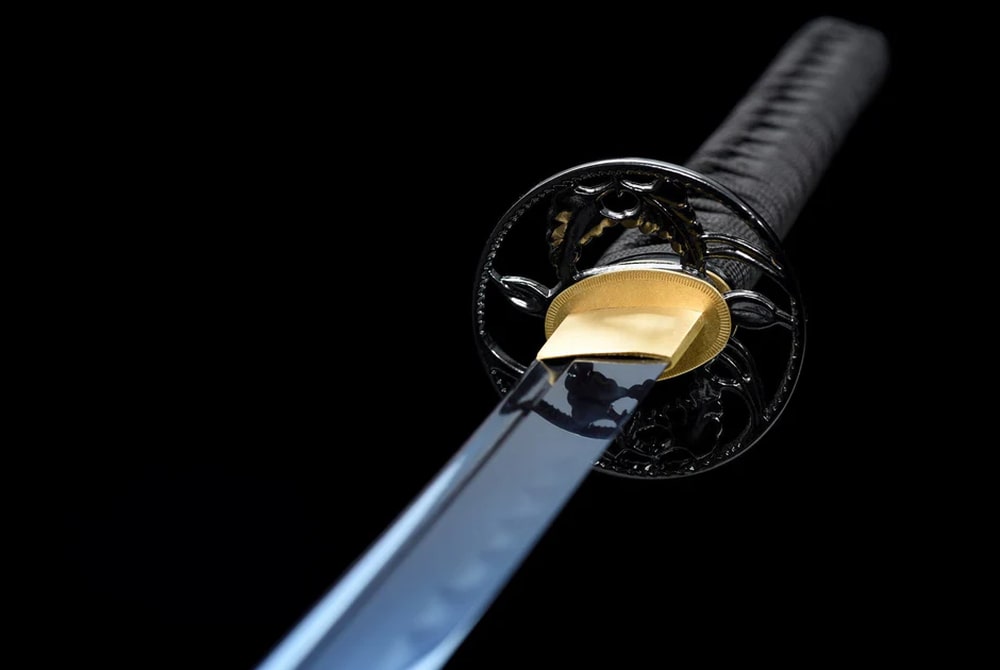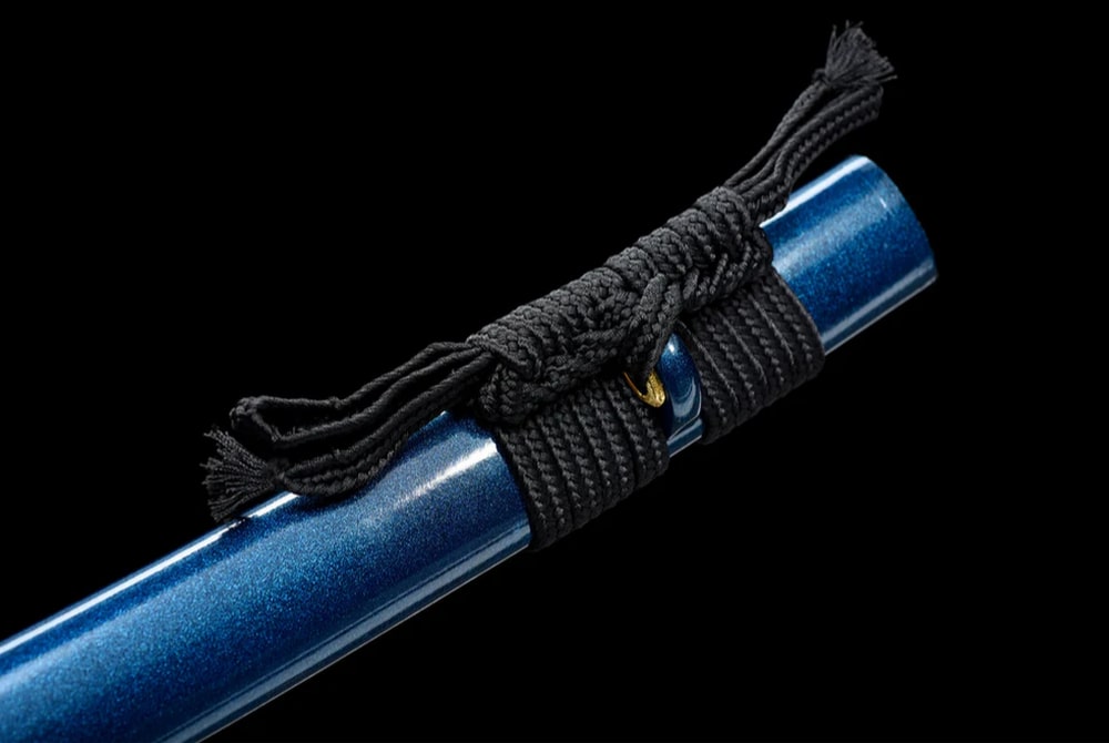 Even though in classical Japanese the word “ao” can mean both blue and green, here it is a deep, pure blue that covers the blade and scabbard of this handmade manganese steel katana. Its metallic, almost celestial shade evokes the purity of the sky after a storm, while the black handle enhances its noble and mysterious appearance.