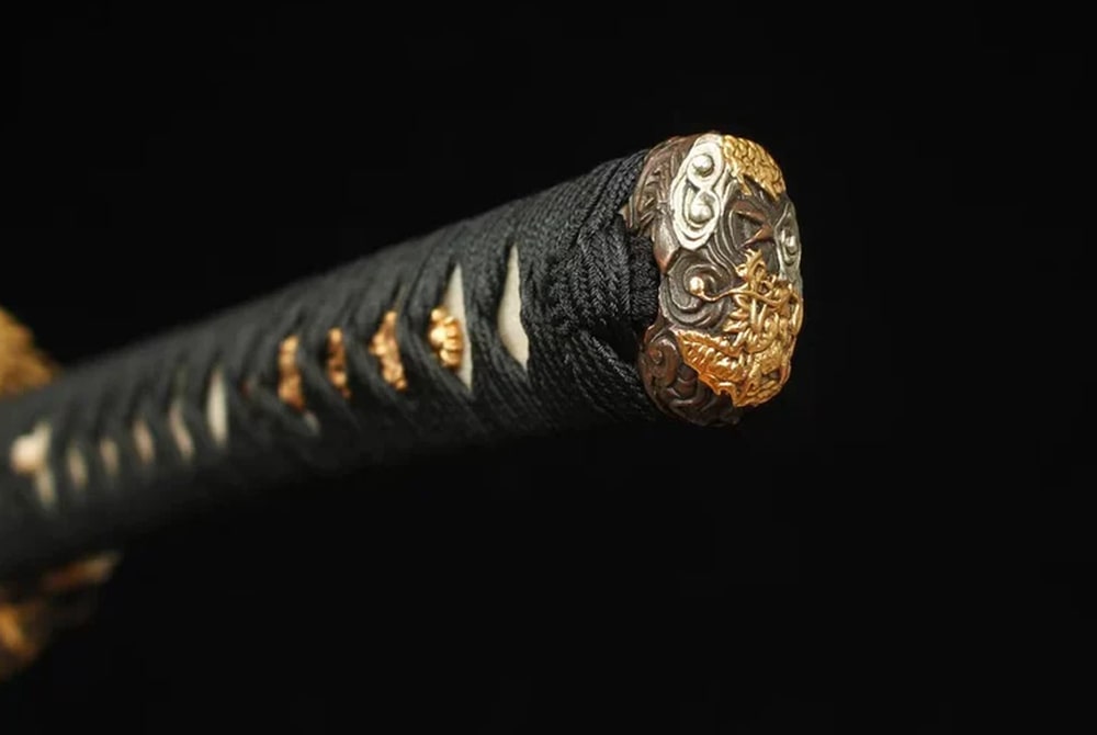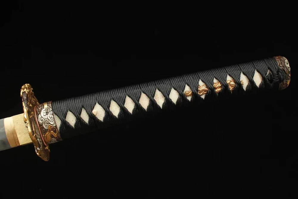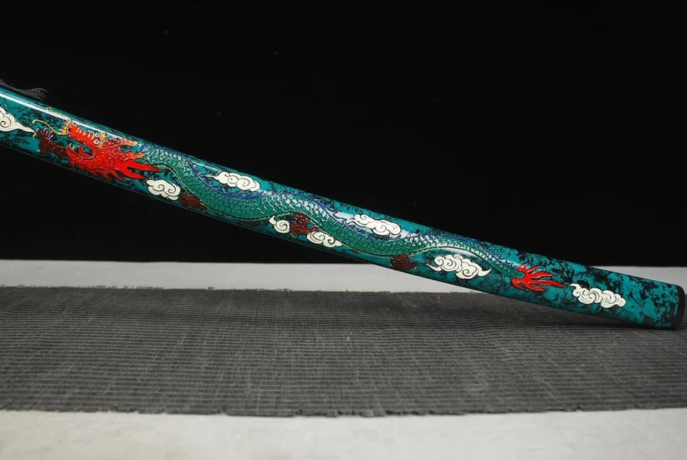 The elegant handle of the katana is wrapped in Japanese silk, offering a comfortable and authentic grip. Genuine ray skin beneath the wrap highlights the meticulous attention to detail. Real gold fittings add a refined touch to this exceptional piece. The saya of the Tatsu no Buke Katana is a work of art in its own right, hand-painted with a majestic Japanese dragon.