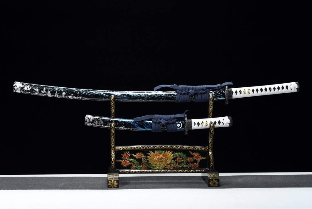 The blade is hand-forged from manganese-rich steel, renowned for its excellent resistance to impact and wear, ensuring strength and long-lasting durability. The solid wood scabbard, finished in dark tones marbled with subtle bluish reflections, stands out with a unique and immersive aesthetic. The finely crafted tsuba evokes lightning and storms, symbols of the samurai’s unwavering determination, while the white fabric-wrapped handle provides a comfortable and well-balanced grip.