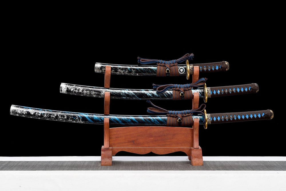 The Hayate Katana Set includes a katana, a wakizashi, and a tantō. Each piece is meticulously hand-forged by skilled artisans, ensuring exceptional quality. The handles and scabbards are adorned with blue accents, adding a unique aesthetic touch to their appearance. The blades are made from high-manganese steel, offering outstanding durability and strength.