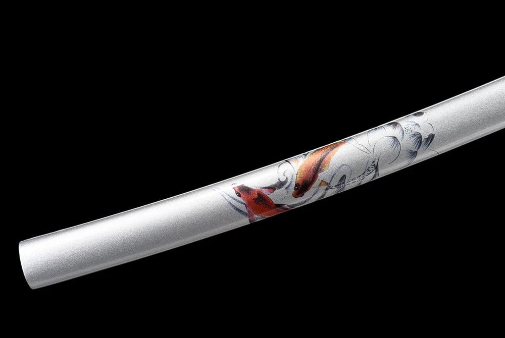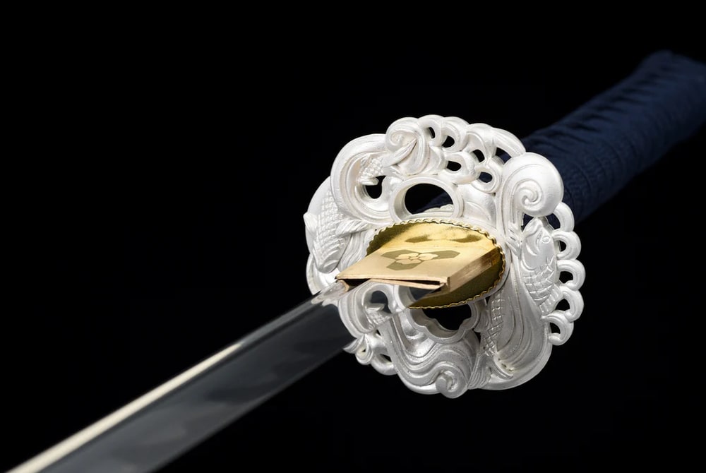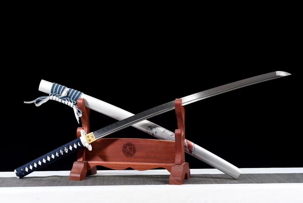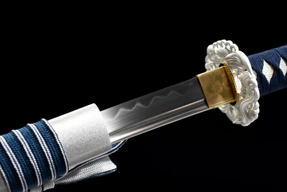 The handle and scabbard stand out with their stunning blend of white and blue, symbolizing elegance and the calm strength of legendary samurai. These colours also evoke the purity of steel and the serenity of peaceful waters.