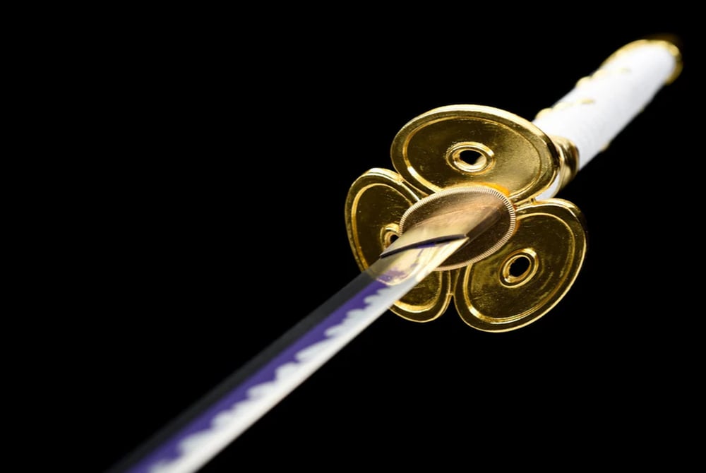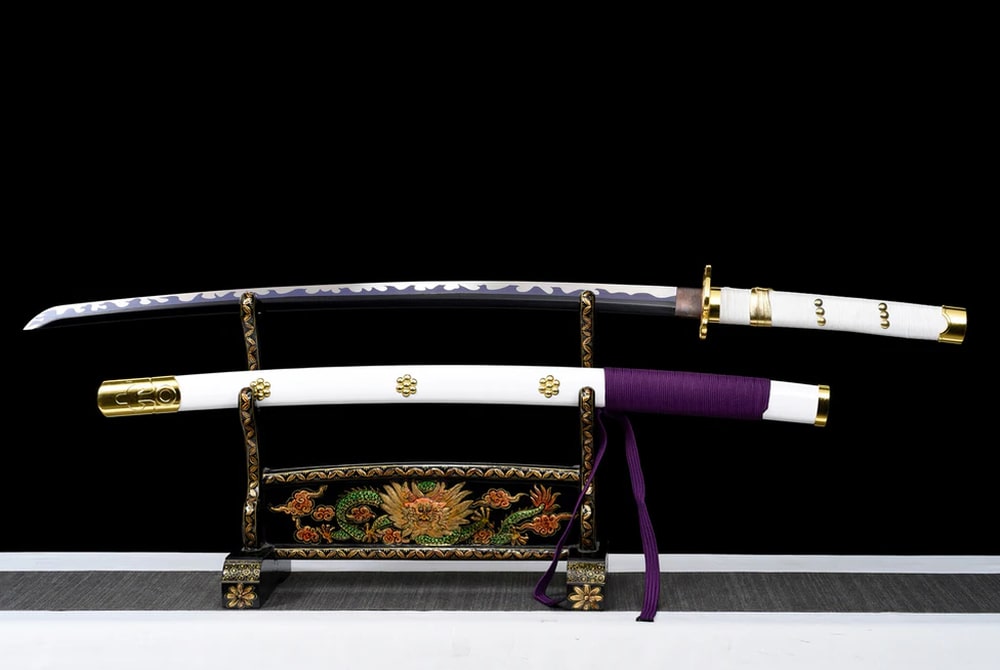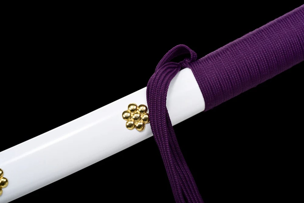 Step into the epic world of One Piece with this exceptional katana inspired by the iconic character Oden Kozuki. A purple blade, clay-tempered and hand-forged using traditional methods, equips this katana that could outshine any manga sword. The white scabbard is made from leather with a wooden core, while the delicate tsuba is crafted from a copper alloy. Every stage of production follows the ancestral rules of katana making, resulting in a carefully finished masterpiece.