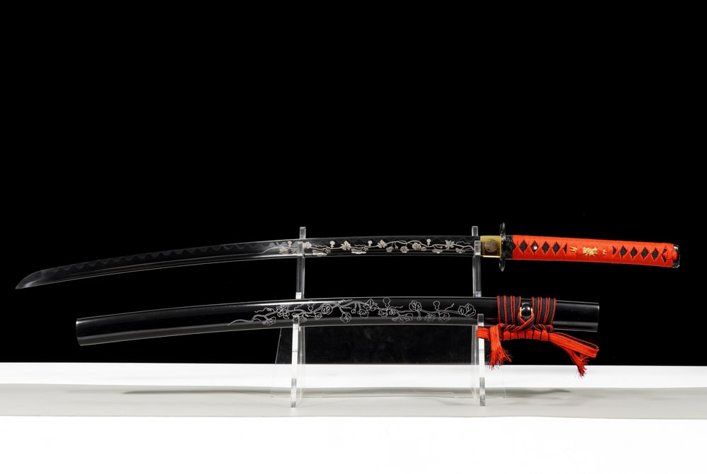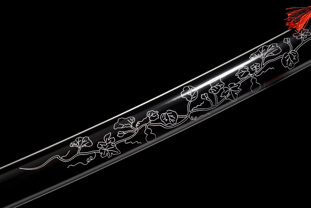 This katana never goes unnoticed. Its dark manganese steel blade reflects power and mystery, while the finely engraved floral patterns recall the fleeting beauty of the world. The striking contrast between the deep black blade and the vibrant red handle creates a powerful visual harmony, symbolising the duality between strength and refinement. Forged for enthusiasts of unique blades, this katana combines balance, durability, and aesthetics, offering its owner a true work of art that is both formidable and poetic.