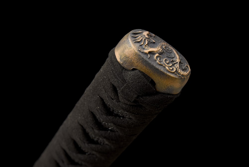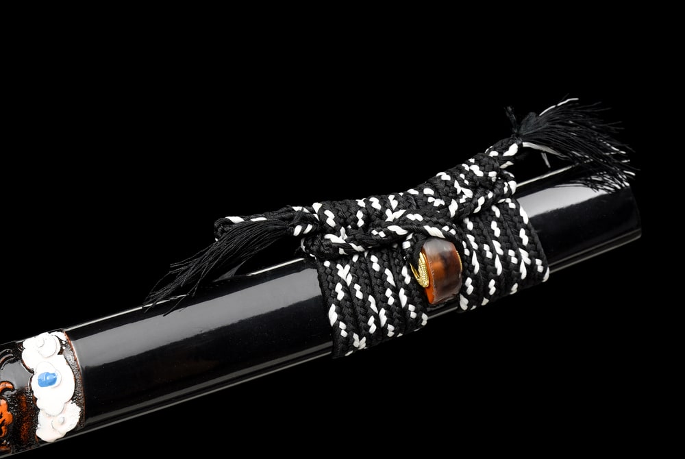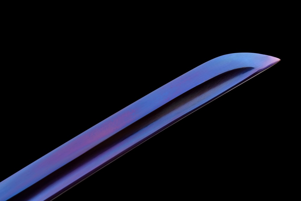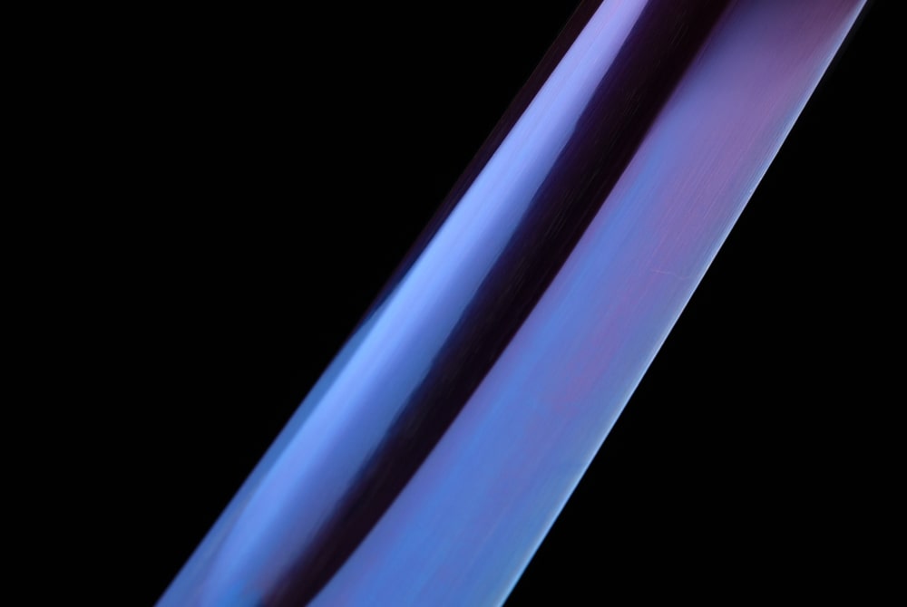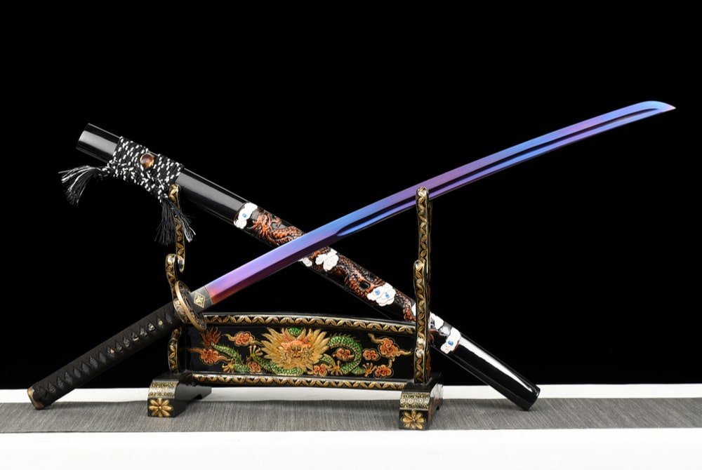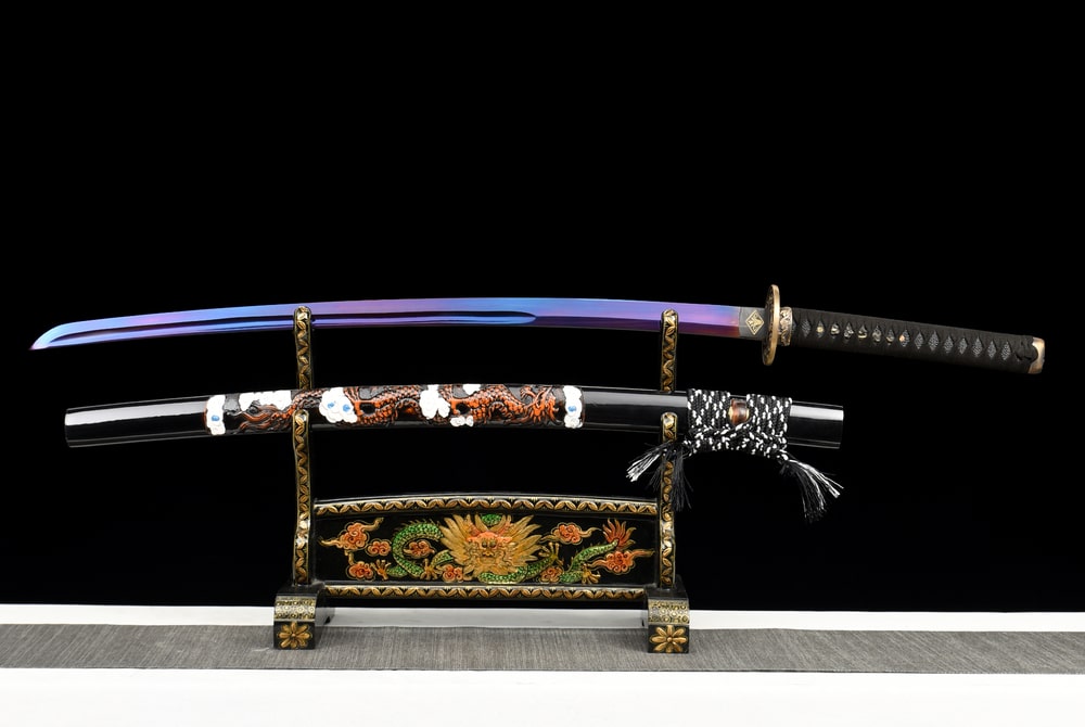 This manganese steel katana stands out with its blade shimmering in blue and violet hues. This interplay of colours gives it an almost mystical presence. Its black scabbard, adorned with a sculpted dragon, evokes Japanese legend and power, while the precise assembly and refined finishes reflect traditional artisanal craftsmanship. A model that is both visually striking and rich in symbolism.