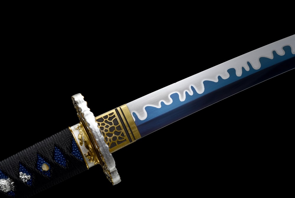 This Japanese wakizashi features a blade decorated with beautiful blue wave patterns. It is hand-forged according to traditional methods. The blade is clay-tempered and made from high-manganese steel. The handle is crafted from solid wood, while the tsuba is made from metal alloy with golden details. The scabbard is also made from painted solid wood.