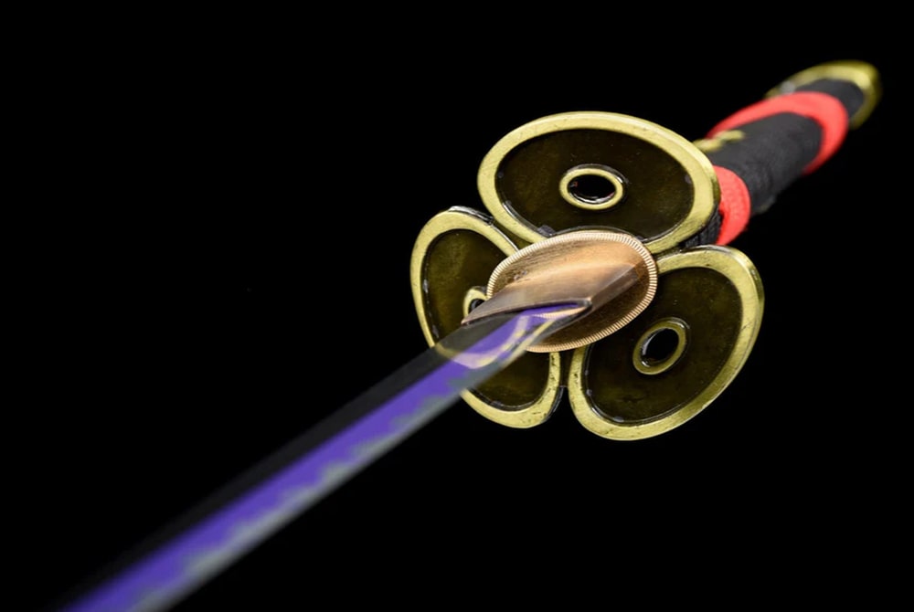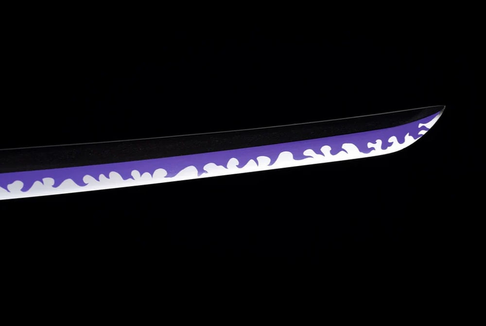 Discover the legendary power of the Enma Katana in its black version, directly inspired by the epic world of the One Piece manga. Hand-forged by expert Japanese artisans, this katana embodies master craftsmanship and the heritage of the iconic swords from Zoro’s universe. The scabbard of this Japanese katana is made from wood and leather, while the handle is crafted from solid wood. Its purple blade, decorated with wave motifs, contains a high proportion of carbon.