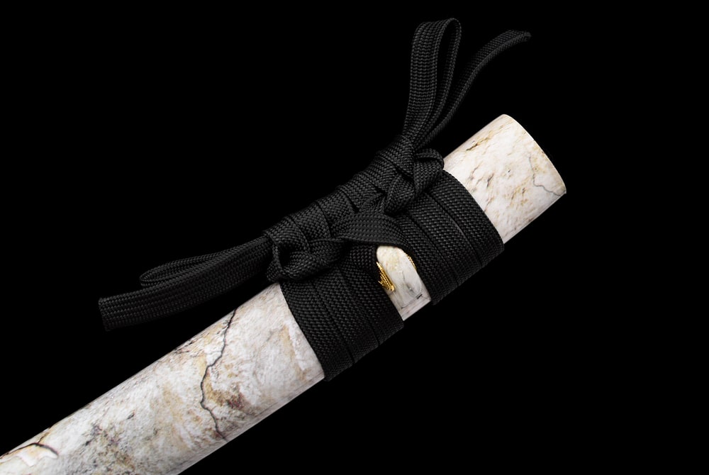 This Japanese T10 steel tantō stands out with a blade featuring a clearly defined hamon, symbolizing strength and balance. Its white marbled scabbard creates an elegant contrast with the black braided handle, offering a look that is both modern and traditional. A refined piece, ideal for demanding collectors.