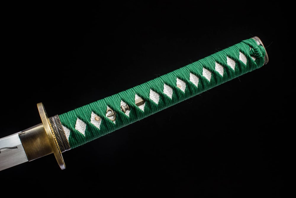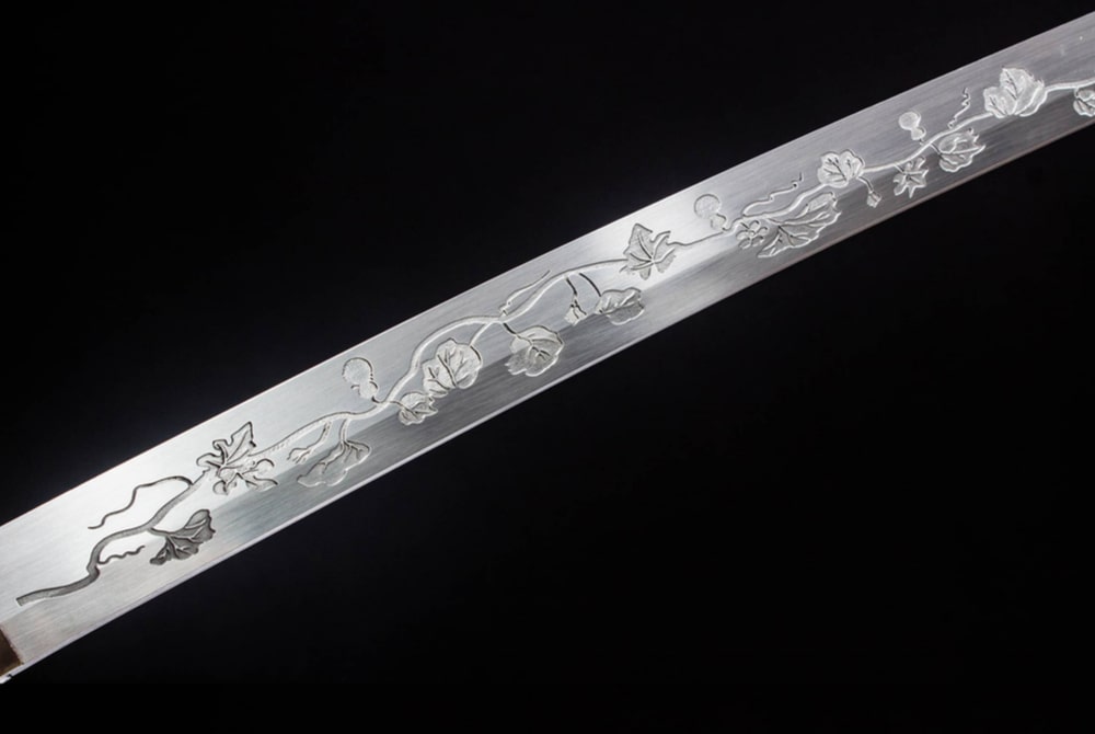 If you love green, this katana is made for you. With its vibrant colour and a manganese steel blade finely engraved with floral motifs, it perfectly combines power and refinement. Its glossy scabbard and braided handle in matching tones evoke nature and Japanese serenity. A unique sword that radiates balance and beauty.