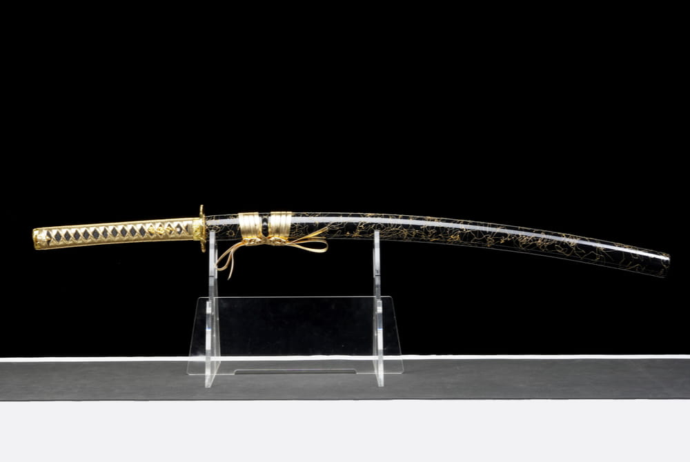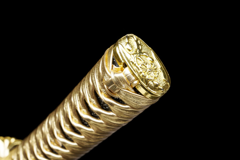 This hand-forged katana immediately stands out with its extraordinary aesthetic. It offers a striking contrast between the deep black scabbard and the golden finishes, creating a look that is both refined and visually powerful. The carefully polished blade is adorned with delicate engravings that add character and reflect genuine artisanal craftsmanship. The finely worked gold-toned tsuba brings a noble and balanced touch to the whole piece, reinforcing the impression of a truly exceptional sword. Every detail has been thoughtfully designed to make this katana a standout piece, both for its beauty and the quality of its construction.