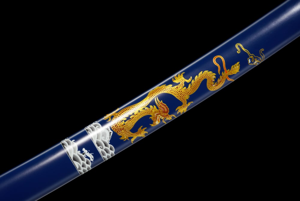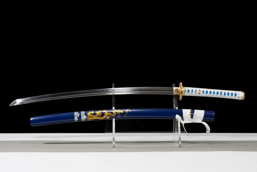 If you appreciate elegant and refined swords, this katana is sure to captivate you. Hand-forged from T10 steel, it features a full tang blade of exceptional quality. Its design blends harmony and nobility: the white handle accented with light blue evokes purity and serenity, while the deep blue scabbard, enhanced with a golden dragon, symbolises power and wisdom. Every detail, from the finely sculpted golden tsuba to the polished blade revealing a magnificent hamon, reflects artisanal craftsmanship worthy of the finest traditional forges.
