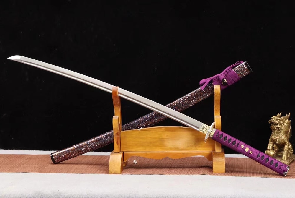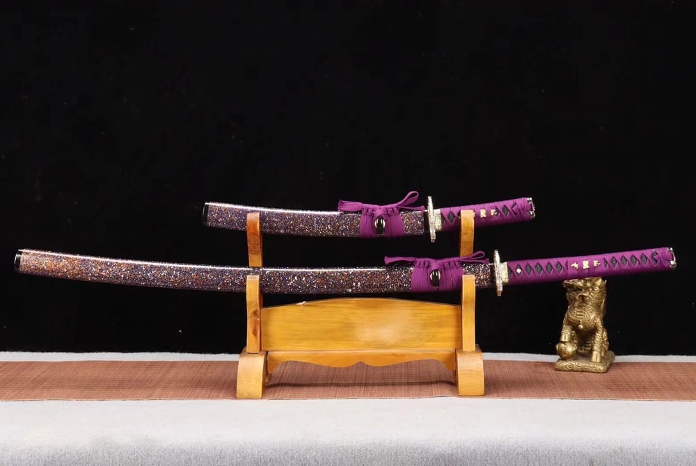 Discover the Murasaki Katana Set, a prestigious collection of high-end Japanese swords that includes a hand-forged katana and tanto crafted by expert artisans. The true highlight of the Murasaki Katana Set lies in its unique aesthetics: the handle and scabbard are beautifully tinted in a vibrant shade of purple. This distinctive colour adds a touch of originality and refinement, making this set a true visual jewel to display in your collection or use in martial practice.