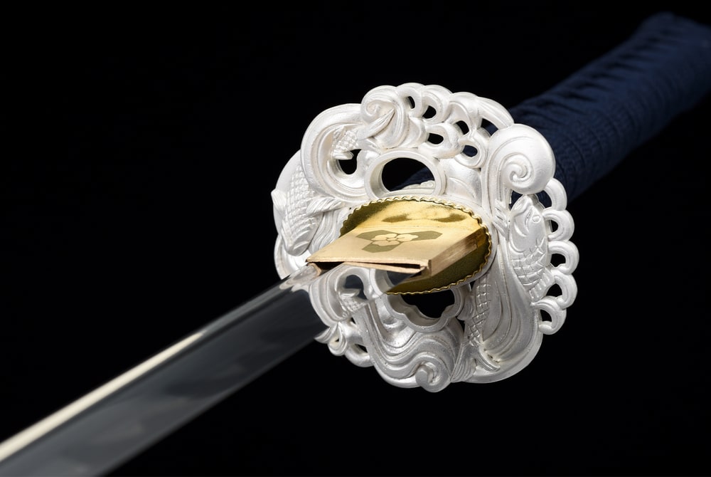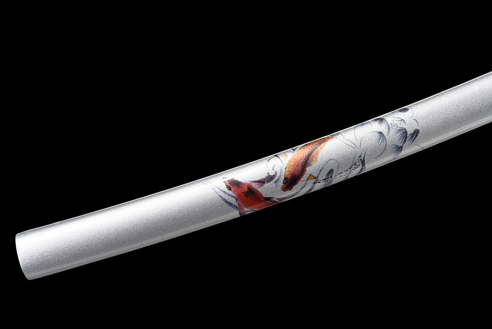 This T10 steel katana embodies pure Japanese elegance. Its finely polished blade, marked by a smooth and flowing hamon, reflects the mastery of traditional Japanese swordsmiths. The pearlescent white scabbard immediately draws the eye, adorned with hand-painted koi carp, symbols of perseverance and good fortune in Japanese culture. The immaculate, finely sculpted tsuba evokes the lightness of water and the serenity of a Zen garden. A katana that is both refined and deeply symbolic, where every detail pays tribute to traditional Japanese aesthetics.