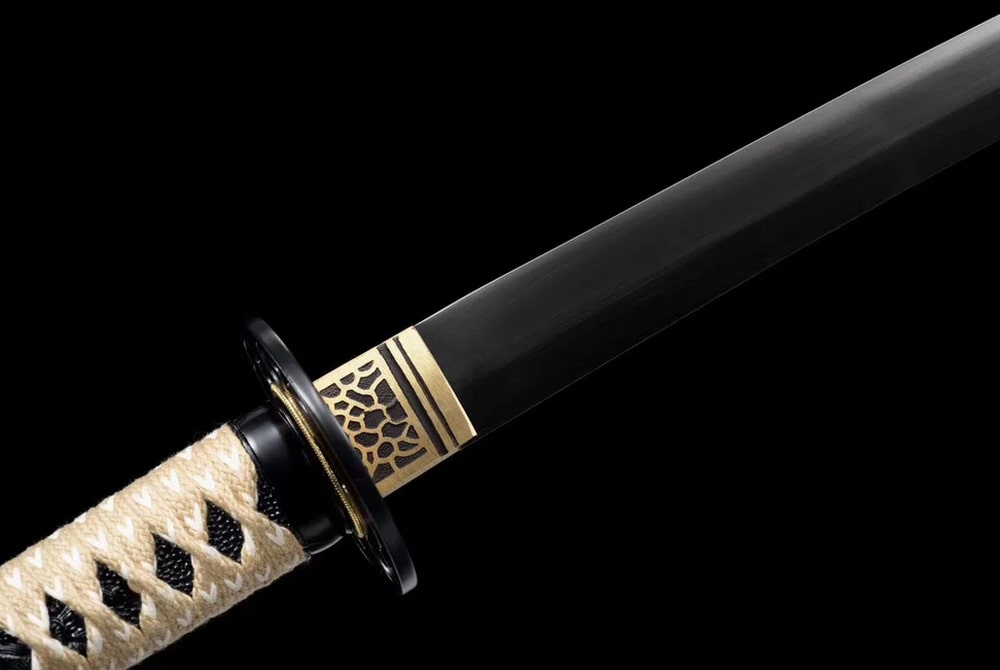 Its black manganese steel blade, carefully polished, evokes the power and mystery of Japanese nights. The scabbard is finely decorated with traditional samurai motifs, depicting ancestral scenes and symbols that give the piece remarkable artistic depth. With its light beige braided handle and flawless finishing, this model blends elegance, authenticity, and intensity — a katana highly appreciated by collectors for its perfect visual balance between strength and aesthetics.